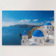Wunderschönes Foto der ikonisch blauen Kirchenkuppeln von Aghioi Theodoroi (Heilige Theodore), das man auf der Klippe von Santorini Island, Griechenland sehen kann.