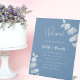 Ein modernes, elegantes Hochzeitsprogramm, Zeitleiste. Dusty blauer Hintergrund, mit Eukalyptus dekoriert, mit Sprigs. Personalisieren und fügen Sie Ihre Namen und Hochzeitsdetails. Wenn Sie mehr Text haben, ist es möglich, den Zeilenabstand zu verringern.