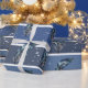 Eine schöne Geschenkpackung mit einem blau-weiß gestreiften Hintergrund und schönen blauen Federn, die Kontrast. Perfekte Verpackung für Geburtstag, Hochzeiten oder Duschen.