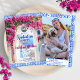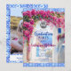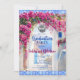 Wasserfarben bemaltes griechisches Inselmamma-Mia-Party-Design mit magenta-pinken Bougainvillea-Blumen und blauen mediterranen Fliesen.