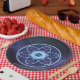 Eine modernistische Pessach-Seder-Platte auf einem Fraktal-Hintergrund. "Pesach" und die Namen jedes besonderen Lebensmittels, das auf einer Siebplatte gefunden wird, sind in hebräischem Text aufgeführt.