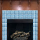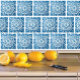 Blaue geometrische Keramik für Kamin, Küche oder Bad. Abmessungen: 6" x 6"w; Dicke: 0,19" Gewicht: 8,5 oz. Aus weißer Keramik Vollfarbendruck, Vollblutdruck