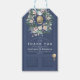 Blaue Hochzeitstür mit Blumenkranz und weißem Text. Ein lustiges niedliches Design für einen Sommer, einen Garten oder eine rustikale Hochzeit, oder für ein Dankeschön-Kartentag für jede Feier.