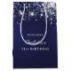 Eine Geschenktasche für einen gmädchenhaften und glamourösen 21. Geburtstag (oder jedes Alter). Ein tiefblauer Hintergrund mit Staub aus Glitzer. Die blaue Farbe ist ungleichmäßig. Personalisieren und fügen Sie ein Datum, Name und Alter 21. Der Text: Der Name ist weiß geschrieben mit einem modernen handgeschriebenen Schrift