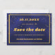 Ein Save the Date für eine 50. Geburtstagsfeier (oder jedes Alter). Ein marineblau gefärbter Hintergrund. Mit einem goldenen Rahmen und Konfetti dekoriert. Für ihn und sie. Gelbe Buchstaben.