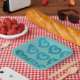 Ein romantisches Design mit zahlreichen handgezeichneten großen blauen Doppelherzen, die über den Teller schwebend. Standardmäßig ist der Hintergrund blass blau, aber Sie können ihn durch eine beliebige Farbe Ihrer Wahl ersetzen.