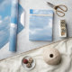 Hübsches, traumhaftes Verpackungspapier, bedeckt von einem strahlend blauen Himmel und flauschigen Wolken. Ideal für jeden Anlass.