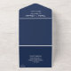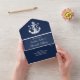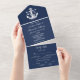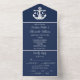 Nautic, marineblau, elegant, modern, Ozean, Boot, gefaltete Ehe, Hochzeit alles in einer Einladung. Das dreifache, budgetäre Set. Sie können es mit Ihren eigenen Daten personalisiert.