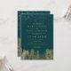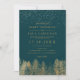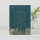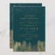 Winterkiefernwald Hochzeit mit goldenen Kiefernbäumen, die ein Wunderland aus Holz und weißem fallendem Schnee zeigen, mit eleganter und moderner Typografie auf essbarem Blau.