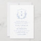 Minimalistische, blau-weiße Hochzeitseinladung, mit Ihren mit Monogramm Initialen gerahmt durch elegantes Wappen und handgefertigten illustrierten botanischen Blätter oben, Ihre Veranstaltungsdetails sind unten in modernem Drehbuch und klassischem Schriftart dargestellt. Einfach und luxuriös. Ideal für moderne klassische Hochzeit, einfache formelle Hochzeit, elegante botanische Gartenhochzeit. Sehen Sie sich alle passenden Stücke in der Sammlung an.