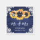 Personalisiert marineblaue, rustikale Hochzeitspapierservietten mit Sonnenblumen auf einem Stallholzhintergrund mit weißem Blumengeflecht und Lichtern aus Streichholz. Matching-Elemente verfügbar.