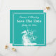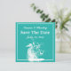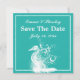 Weißes Seepferd auf blaugrüne Sommerhochzeit Save the Date zeigt ein weißes Seepferd und einen weißen gepunkteten Rahmen auf hellen Meer grün. Ideal für Hochzeiten am Strand.