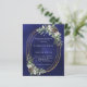 Für eine Winterhochzeit. Marineblau, uneinheitlich gefärbter Hintergrund mit Kegel, weißen Beeren und grüner Farbe. Ein ovales Imitat aus Gold. Personalisieren Sie Ihre Namen und Details und fügen Sie diese hinzu. 1 Blatt = 1 Einladung mit Druckkante bis Kante.