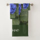 Nah-up der blauen Hydrangea mit großen grünen Blätter. Das größere Handtuch hat oben und unten eine grüne Grenze mit dem Wort Liebe in weißer Schrift. Grüne Grenze oben auf dem unteren Teil des Blumenbildes. Original Fotografie von TamiraZDesign.