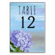 Blaue Hydrangeas Hochzeit Tischnummer Karte. Es zeigt blau-lila Hortensie oder Hydrangea-Blume auf blauem und lavendischem lila Aquarellhintergrund. Einige Elemente mit freundlicher Genehmigung von ArtsyBee, Pixabay.