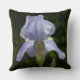 Hübsche blaue Iren Reversible Throw Kissen. Die Vorderseite des Kissens hat eine nahe hübsche blaue Iris-Blume mit gelben und regen Tropfen auf seine zarten Blätter mit einem Blume Knospen gewartet, um im Frühling zu blühen. Auf der Kissenrückseite ist die blaue Irishälfte nah, die mit Regentropfen und einer Blume auf langen Stangen und unscharfen grünen Bäumen im Hintergrund geschlossen ist. Fotografien aus dem Irisgarten. Original Fotografie Copyright © TamiraZDesign.