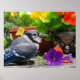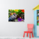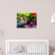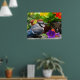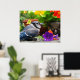 Dieses farbenfrohe Poster besticht durch eine blaue Jay, die auf einer von Blume umgebenen Terrasse gelandet ist. Die blaue, graue, weiße und schwarze Färbung des Vogels wird durch einen Aufruhr von Set abgelöst. Es gibt einen dekorativen Teekessel mit orangefarbenen und gelben Nururien und einer lila Petunia. Grüne Blätter ergänzen dieses Kaleidoskop von Farben.