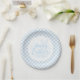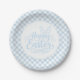 Partyteller aus Papier wird in einem süßen hellblauen und weißen Karo-Osterndruck gezeigt.