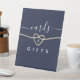 Elegantes, minimalistisches, marineblaues Hochzeitstabletop-Schild mit Imitaten goldenes Seilherz und modernem handgeschriebenem Kalligrafieschreiben.