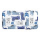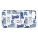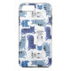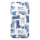 Ein Gehäuse mit einem Muster von Cartoon in verschiedenen Blau- und Grautönen auf weißem Hintergrund. Die Katzen sind stilisiert und vereinfacht, mit minimalen Details. Manche Katzen liegen, andere sind stehend oder sitzen. Das Muster ist dicht und deckt die gesamte Oberfläche des Gehäuses ab.