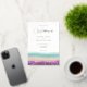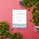 Hochzeitseinladung mit heller Azurblau und rosa Magenta Naturlandschaft mit blühender Küste und Bergen. Die sonnige Naturlandschaft. Silhouetten von Bergen, Meeresküste und leuchtend rosa und violette Blumen. Aquarellmalerei Hintergrund Hochzeit Einladung. Die blaue Küste in Bloom Collection.
