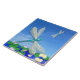 Diese farbenfrohe Keramik-Kachel zeigt mein Design von türkisfarbenen Libellen, die sich in einem wunderschönen blauen Himmel über den Wasserlies in einer schönen entspannenden Szene bewegen. Ideal zum Aufhellen eines Tischdecks oder einer Theke. Ein großartiges kleines Geschenk.
