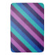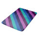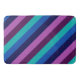 Eine große Badematte mit farbenfrohen Mustern aus diagonalen Streifen in coolen aquamarinen, ozeanblau, marineblau, pflaumenlila und Lavendel.