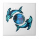 ein dekoratives Kunstwerk zweier blau gefärbter Delfine, die auf einer Kreamikatziegel einen ebenso blauen Mond umrunden.