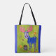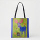 Eine geräumige Tasche mit einem wunderschönen, perplexen Blick blauen Elche und drei whimsical kleinen Freunden, die sein Mittagessen teilen. Die ursprüngliche Malerei wurde in Acrylfasern vom Designer gemacht. Diese Tasche ist garantiert, die Herzen zu heben und Kommentare und Lächeln, wann immer sie getragen wird. Genießen Sie tragbare und funktionale Kunst, die aus Originalgemälden entstanden ist.