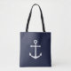Moderne Minimalistische Nautical Tote Bag mit weißem Anker auf marinebasischem Hintergrund.