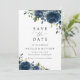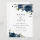 Mit dieser bezaubernden Save the Date Karte laden Sie Freunde und Familie in Stil und Set ein. Das Design ist mit marineblau-blauen Blume und Grünpflanzen auf weißem Hintergrund gestaltet.