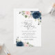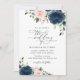 Mit dieser charmanten Hochzeitseinladung laden Sie Freunde und Familie in Stil und Set ein. Das Design ist mit Marineblau- und Rosa-Blume und Grün auf weißem Hintergrund gestaltet.