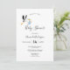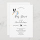 Eine niedliche Einladungskarte für Babyduschen, die einen kleinen Jungen feiert. Ein stilvoller weißer Hintergrund, schwarze Buchstaben. Mit einem fliegenden Storch, der einen kleinen Jungen hält. Personalisieren und fügen Sie den Namen der Mutter-zu-sein und Ihre Party-Details. Zurück: ein Storch, der ein Baby hält, weißer Hintergrund