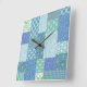 Eine schicke Boho Square Acrylmauer-Uhr mit einem ländlich anmutenden Imitat Patchwork aus verschiedenen hübschen Periwinkle-Blumenmustern und Koordination von Karo Gingham-Mustern in Blau, Grün und Weiß. Als Teil der Posh und Painterly 'Periwinkle Patch' Kollektion kann dieses Muster leicht an jede Wall Clock angepasst werden.