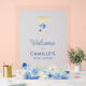 Elegante blaue Blütenblätter und Prosecco Begrüßungszeichen. Sip, Schluck, Hurra! 🥂 Set den Ton für Ihre fabelhafte Brautparty-Feier. Mit wunderschönen Blumen und einem hellblauen Hintergrund ist dieses Willkommensschild sicher ein Hit. Passende Artikel in unserem Shop Cava Party Design.