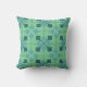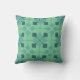 Dieses Kissen hat ein modernes Design von Pfeilen in zwei Blautönen auf einem Feld von Meeresgrün.