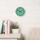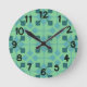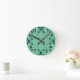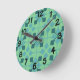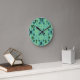 Diese Wanduhr hat ein modernes Design von Pfeilen in zwei Blautönen auf einem Feld von Meeresgrün.