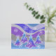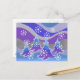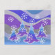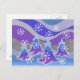 Eine moderne, stilvolle Winterlandschaft mit mattierten Kiefern und glitzernden Schneeflocken. Postcard mit einem blauen, lila, silbergrauen und weißen, anpassbaren Design für Sie, um mit Ihrem eigenen Text, Bildern und Ideen zu personalisieren. Ein digital verstärkter Bleistift, der von Jess Perry gezeichnet wird.