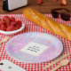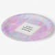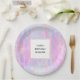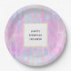 Geburtstagspapier-Teller mit einem abstrakten Hintergrund. Rosa lila und blaue Aquarellfarben bilden dieses künstlerische Design, das vertikale rechteckige Formen auf einem weichen, motlisierten Hintergrund aufweist. Ein quadratisches Oberteil mit einem goldenen Rahmen in Imitaten, der personalisierte Text im Inneren.