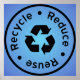 Reduzieren, wiederverwenden, Plakat gerecycelt - schwarze Schrift und recycelnd Symbol auf einem verblassten blauen Hintergrund.