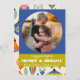 Retro-Baum-Ornamente machen diesen Urlaub grüßen farbenfroh und nostalgisch. Ein Foto auf der Vorderseite in einem Kreisrahmen, um Ihre Familie zu markieren.