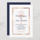 Mit dieser eleganten Einladung mit modernen Schriften, vergoldetem Kupfer-Rose und marineblau-blauem Text, darunter eine künstlerische Palme und ein Kupferrahmen metallischer Rose, laden Sie Ihre Gäste ein, Ihren besonderen Tag zu feiern. Auf der Rückseite der Karte befindet sich ein blauer, koordinierender Hintergrund. Wenn Sie Hilfe oder eine individuelle Bestellung benötigen, kontaktieren Sie mich bitte.