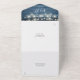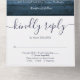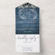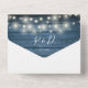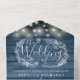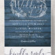 Alles in einer Hochzeitseinladung mit hübschen Saitenlichtern, handgezeichnet Blumengarten und schicker Typografie auf blauen rustikalen Holzpaneelen. Die Einladung enthält eine perforierte RSVP-Karte, die für Sie individuell adressiert oder links als leere Karte für die Handschrift der Adressdaten Ihres Gastes verwendet werden kann. Entwickelt von Thisisnotme©