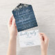 Alles in einer Hochzeitseinladung mit hübschen Saitenlichtern, prächtigen Stilnamen und schicker Typografie auf blauem rustikalem Holzhintergrund. Die Einladung enthält eine perforierte RSVP-Karte, die für Sie individuell adressiert oder links als leere Karte für die Handschrift der Adressdaten Ihres Gastes verwendet werden kann. Entwickelt von Thisisnotme©