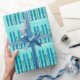 Blaue Skis auf Schnee mit blauem Hintergrund Weihnachtsverpackungspapier.