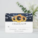 Navy blauen rustikalen Blumen-Hochzeitskarte RSVP mit Sonnenblumen und Lichtern an der Saite vor einem rustikalen Holzhintergrund. Perfektes Kartendesign, um Ihr marineblaues rustikales Land zu ergänzen, oder Scheunenhochzeit, inspiriert von Sonnenblumen-Blume.
