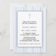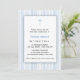 Erste Einladung der heiligen Kommunion mit blauer und weißer gestreifter Grenze und kleinem blauem Kreuz.