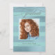 Dieses Design ist eine unverwechselbare Abschluss-Ankündigung mit einem eleganten Stil und einem Imitat-Streifenmuster in schimmerndem Blau und Aqua. Schöne Skript-Schnörkel betonen das Design mit dem Wort "graduate". Ersetzen Sie das Beispiel-Foto, indem Sie das gewünschte Foto mit der benutzerfreundlichen Vorlage hochladen. Personalisieren Sie den Text mit dem Namen, der Schule und dem geschlossen Jahr Ihres Absolventen. Dieses Design funktioniert gut für eine High School, Uni, Vorbereitungsschule, Krankenpflegerschule, Meditationsschule, Jurastube, Business School und andere Abschlüsse.