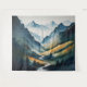 Diese faszinierende horizontale Tapisserie präsentiert eine atemberaubende Bergkulisse, meisterlich in beruhigenden Blau- und Bräunungstönen dargestellt, die ein Gefühl der Gelassenheit und Ehrfurcht wecken. Im Herzen der Komposition schlängelt sich ein kristallklarer Bach sanft den Berg hinunter, sein Wasser reflektiert die azurblaue Farbe des Himmels und schafft eine harmonische Farbenmischung, die Ruhe ausstrahlt. Die Berge, die in verschiedenen Bräunungsfarben dargestellt sind, erheben sich majestätisch vor der Kulisse, ihre Gipfel berühren den Himmel, was sowohl auf ihre Grandeur als auch auf die zeitlose Schönheit der Natur hindeutet.