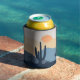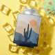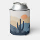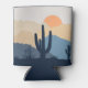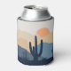 mexikanische Wüste bei Sonnenaufgang mit Sonne, Bergen und Kakteen Dekoration in marineblau, orange, blau und beige Farben auf pastellgrauem Hintergrund